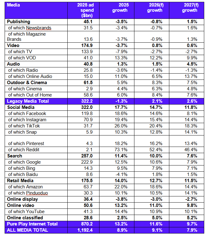 Elsewhere in Europe, Germany (+9.3% to $34.4bn in 2025, +8.3% in 2026, +4.7% in 2027), France (+8.9% to $21.9bn in 2025, +7.2% in 2026, +4.3% in 2027), Italy (+7.4% to $12.4bn in 2025, +6.8% in 2026, +4.1% in 2027), and Spain (+9.8% to $10.7bn in 2025, +8.7% in 2026, +5.4% in 2027) are all poised to sustain ad market growth throughout the forecast period.